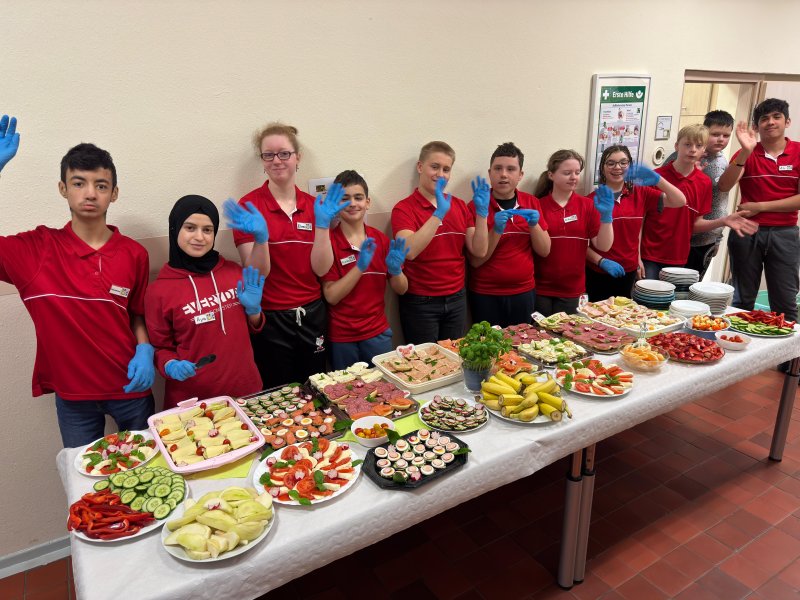 en verwandelt sich der Flur der ersten Etage in ein buntes Frühstücksbuffet – liebevoll vorbereitet von den Schüler*innen, initiiert von der LG4. Mit roten T-Shirts und Namensschildern sind die Frühstückshelfer*innen im Einsatz, servieren Leckereien mit Handschuhen und Zange, und sorgen dafür, dass sich alle wohlfühlen. ![]()
