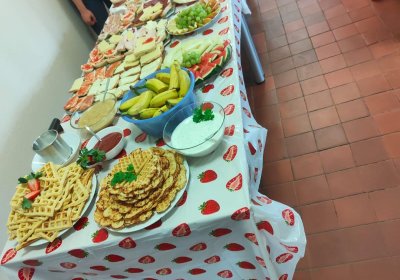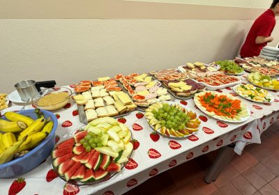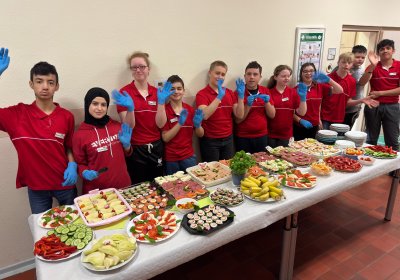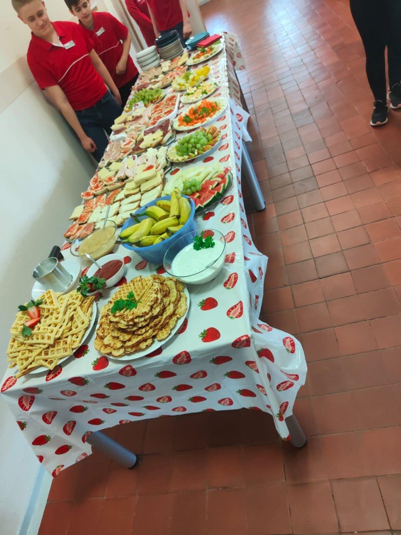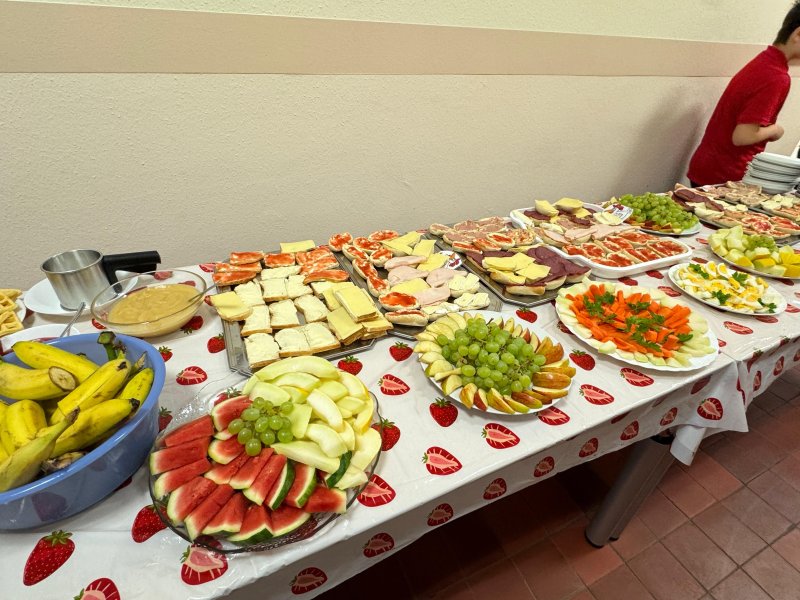 en verwandelt sich der Flur der ersten Etage in ein buntes Frühstücksbuffet – liebevoll vorbereitet von den Schüler*innen, initiiert von der LG4. Mit roten T-Shirts und Namensschildern sind die Frühstückshelfer*innen im Einsatz, servieren Leckereien mit Handschuhen und Zange, und sorgen dafür, dass sich alle wohlfühlen. ![]()