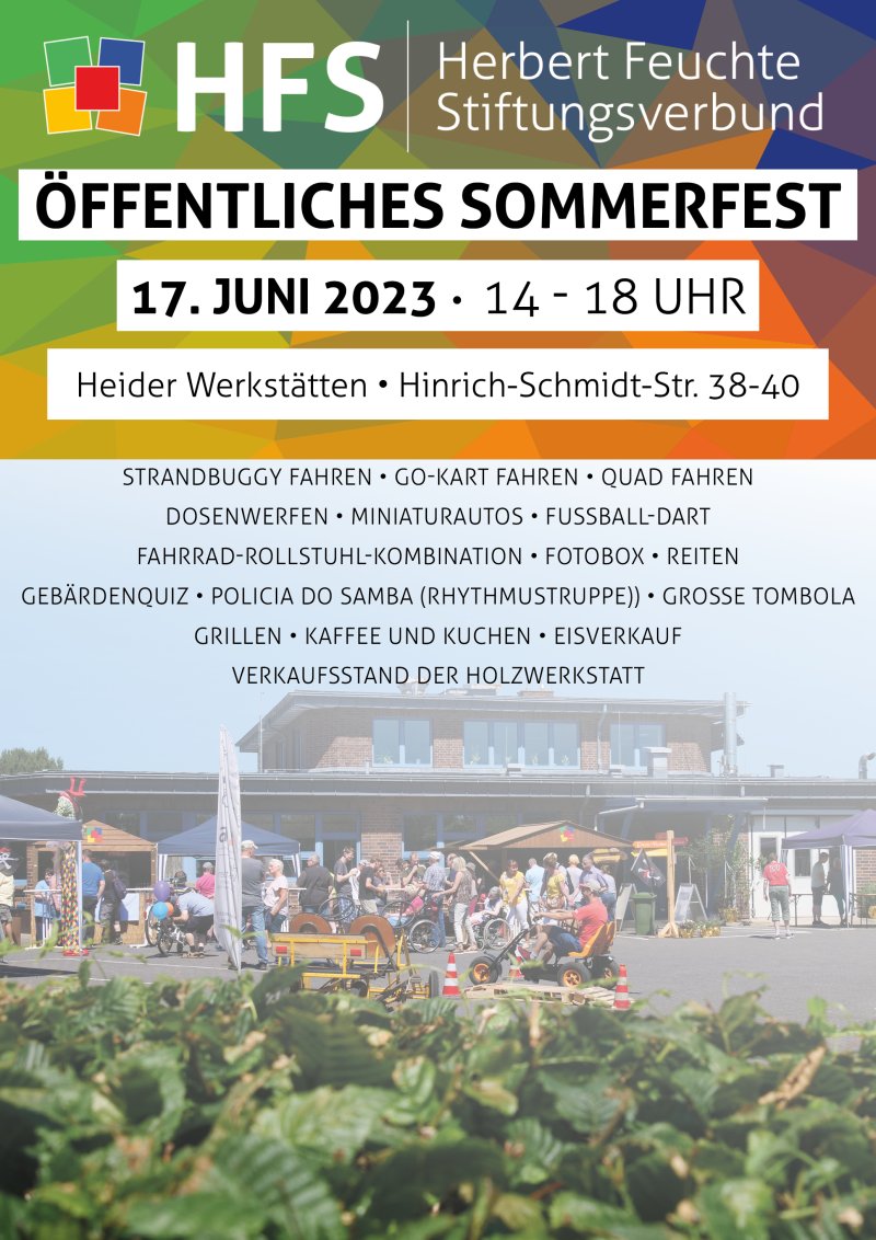 Am Samstag, 17. Juni laden wir Sie herzlich zu unserem Sommerfest in die Heider Werkstätten ein. Am Nachmittag von 14 - 18 Uhr erwartet Sie dort ein buntes Aktionsprogramm.