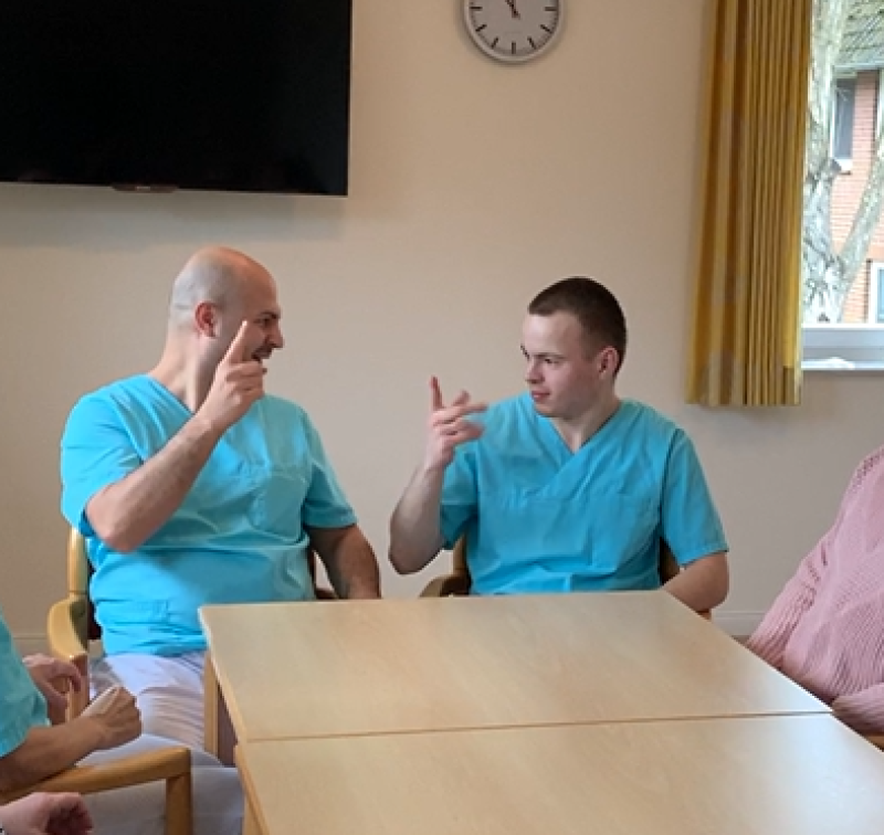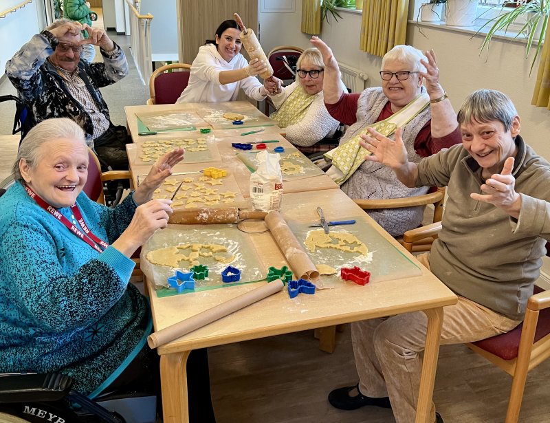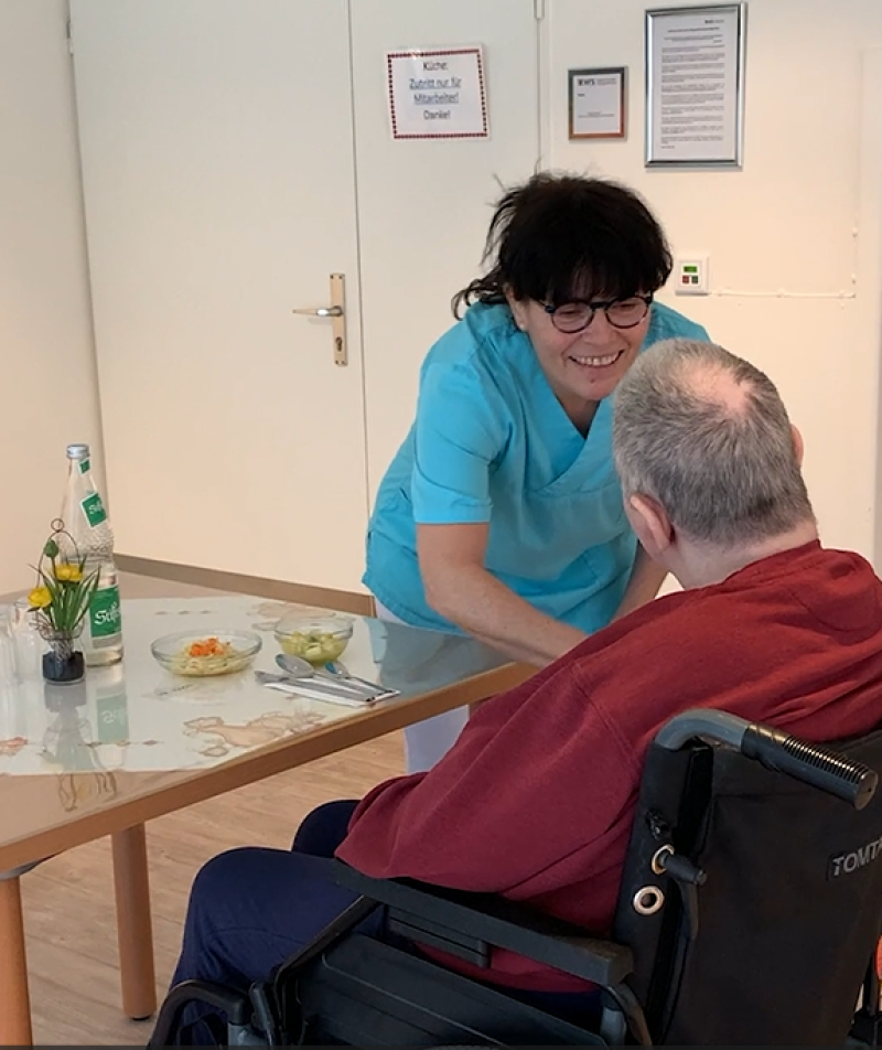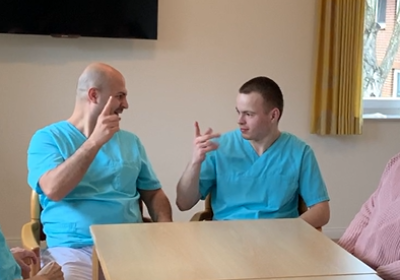 Kommunikation gehört zu den existenziellen Aktivitäten eines Menschen. Deshalb beherrschen unsere Mitarbeiter*innen die Gebärdensprache und bilden sich darin laufend weiter. Sie stellen die Menschen, die bei uns ihren Lebensabend verbringen, konsequent in den Mittelpunkt ihrer Arbeit und bieten ihnen eine qualitativ hochstehende Betreuung und Pflege rund um die Uhr. Dazu gehören regelmäßige Veranstaltungen, Ausflüge und zum Beispiel auch Gottesdienste in Gebärdensprache. Für Bewohner*innen mit erheblich eingeschränkter Alltagskompetenz gibt es spezielle Betreuungsangebote.